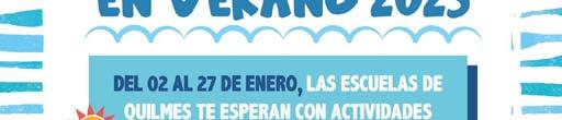 El Municipio de Quilmes informa que se encuentra abierta la inscripción para actividades artísticas, lúdicas, deportivas y acuáticas, en el marco del programa Escuelas Abiertas en Verano 2023, en los distintos establecimientos educativos que son sede a lo largo y ancho del distrito. La actividad se estará desarrollando desde el 2 al 27 de enero.