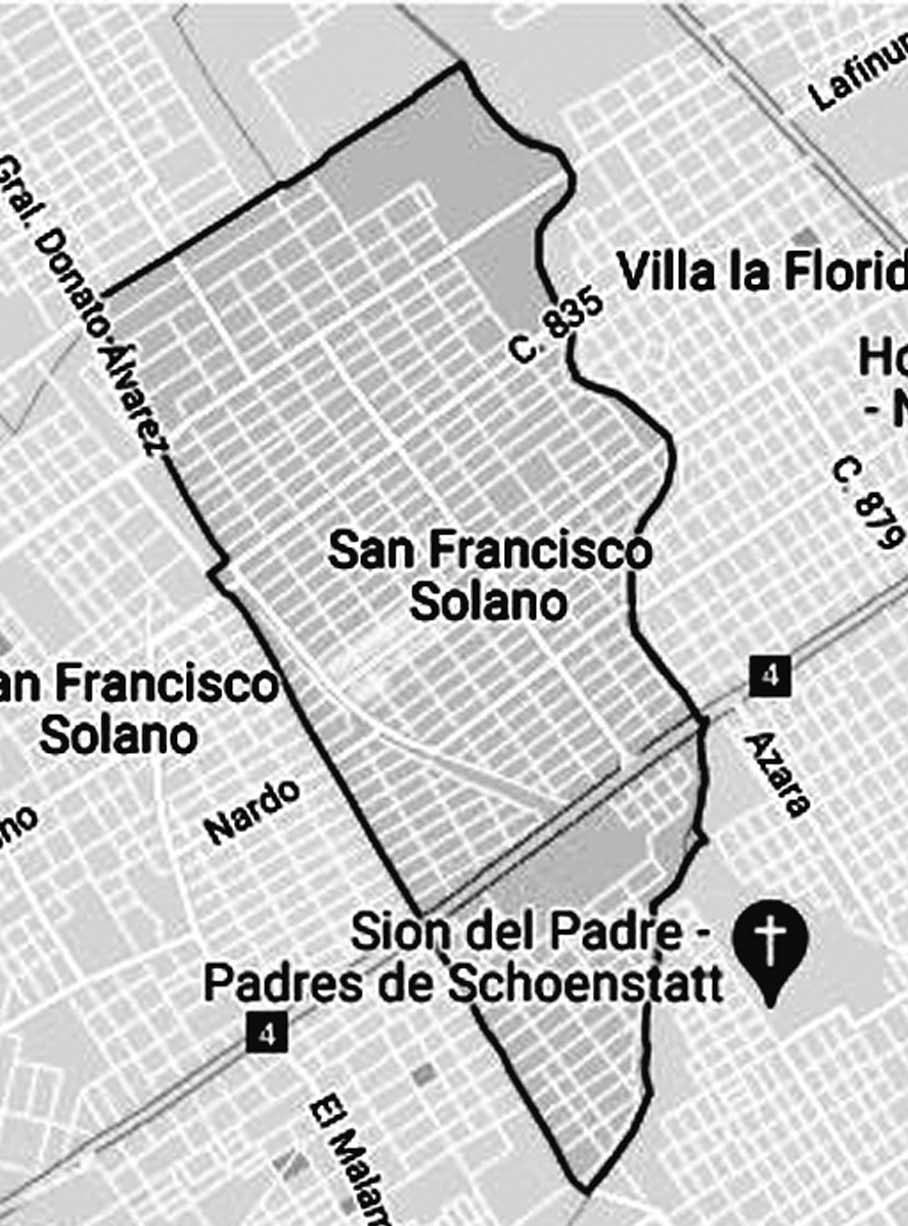 san Francisco solano es una ciudad bonae rense repartida entre los partidos de Quilmes y Almirante Brown. e n 1947 hubo más lo teos en lugares cerca nos como el actual Ba rrio Parque Calchaquí y en 1949 hacia el norte en v illa La Florida entre Camino General Belgra no y el Arroyo de las Piedras.