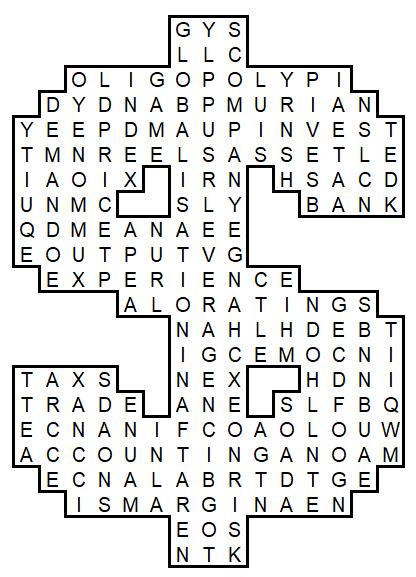 Have you ever seen a puzzle like this? Probably not, so this is a once-in-a-lifetime opportunity to complete this challenge. Your task is to find these terms related to the economy below in the special dollar-shaped figure. Pay attention, words can be hidden horizontally, vertically, and diagonally in any direction! If you found all of them, you can read the remaining letters line by line to get the punchline of the joke.
