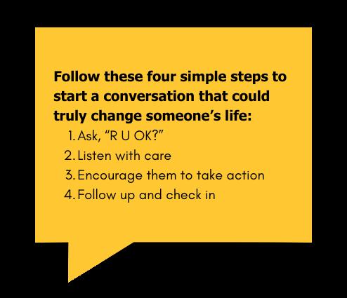 You don’t need to be a professional to make a difference - just a caring friend and an attentive listener. Asking “are you OK?” may seem small, but it can have a powerful impact.