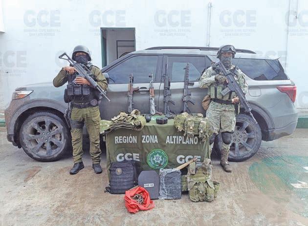 calibre 7.62×39; un cargador tipo tambor y 279 cartuchos de este mismo calibre, al igual que 23 cartuchos útiles calibre .223. Además de cuatro chalecos tácticos, con siglas de una supuesta célula criminal y una bolsa con 25 artefactos metálicos, conocidos como “poncha llantas”; una granada de fragmentación y una tabla de madera.