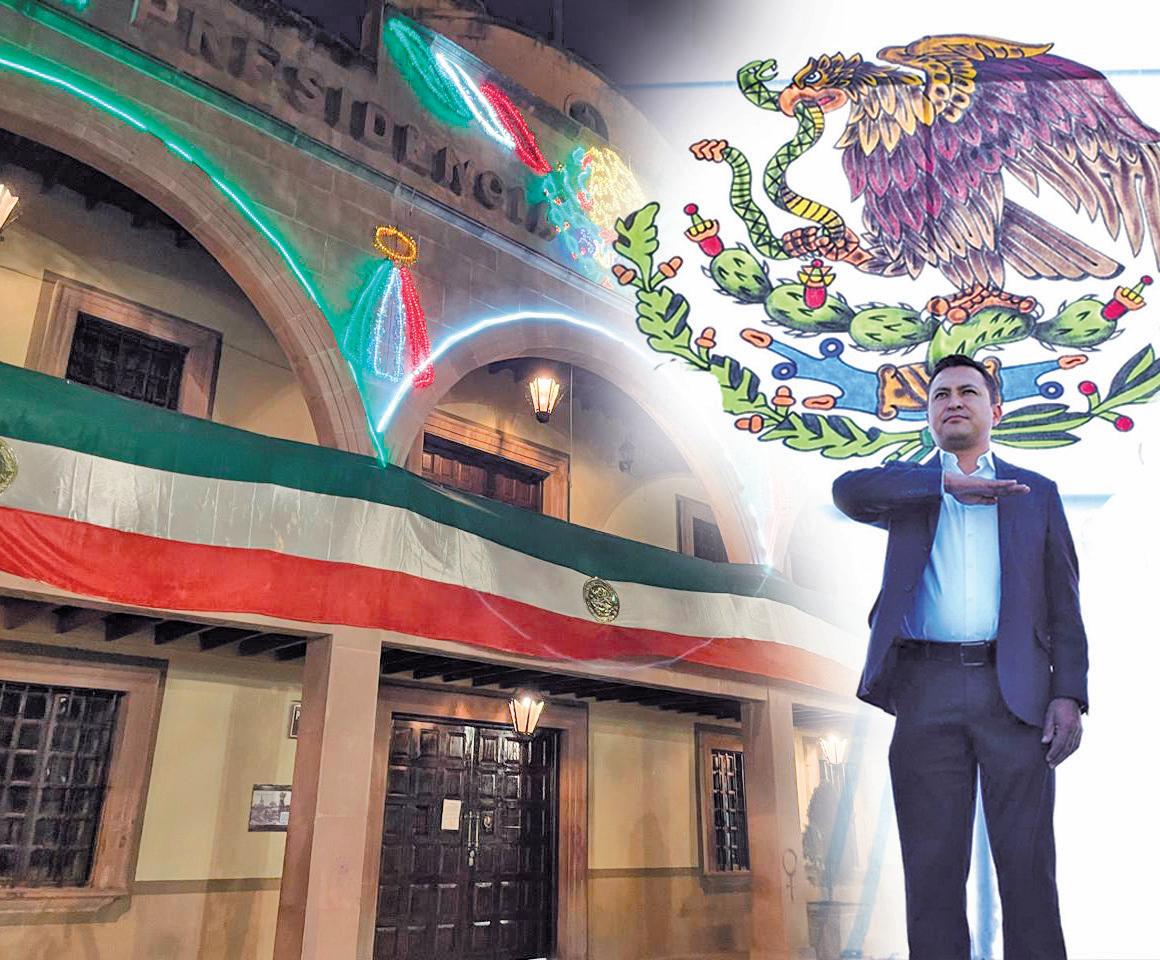 pendencia de México, en un ambiente lleno de patriotismo y orgullo nacional. Al caer la noche, el alcalde recibió el símbolo patrio para dirigirse al balcón de Palacio, donde una multitud de familias lo esperaban con entusiasmo. Con la bandera en alto, Coronado Guerra gritó: “¡Vivan los Héroes que nos dieron