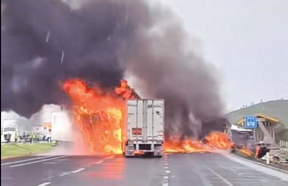 Infierno en la 57; Tres tráileres calcinados en carambola