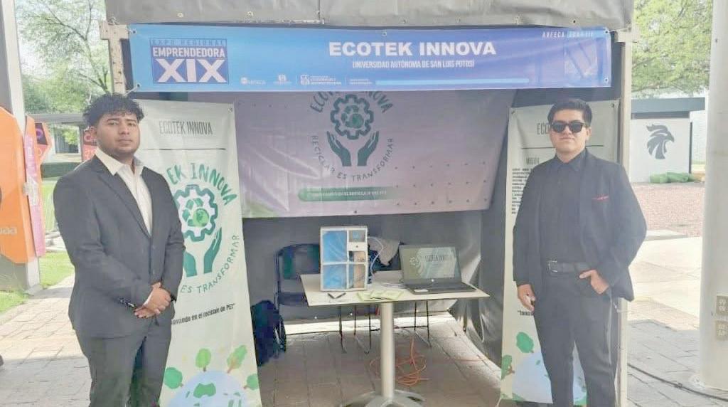 Michael Alexander González Martínez y Carlos García Tovar, estudiantes de Ingeniería Mecatrónica e Ingeniería Mecánica Administrativa en la Unidad Académica Multidisciplinaria Región Altiplano (UAMRA), obtuvieron el primer lugar en la categoría de Tecnología en la XIX Expo Regional Emprendedora Zona III ANFECA, con su proyecto “Ecotek Innova”.