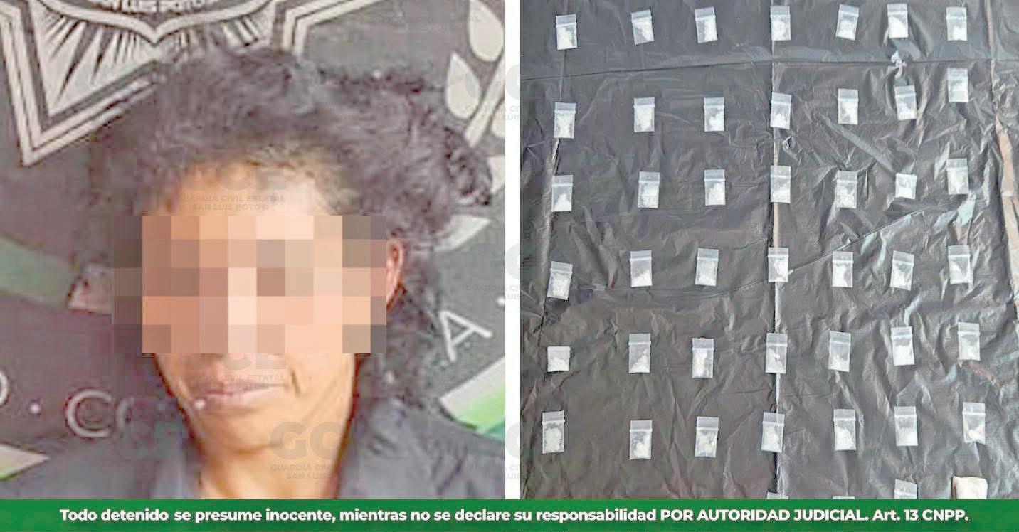 San Luis Potosí, 5 de julio de 2025.La Secretaría de Seguridad y Protección Ciudadana del Estado informó sobre la detención de Jessica “N”, de 39 años, en un operativo realizado por la Guardia Civil Estatal en el eje estatal Moctezuma-Villa de Arista, en la zona Altiplano. La mujer fue sorprendida en posesión de 49 dosis de la droga conocida como “cristal”.