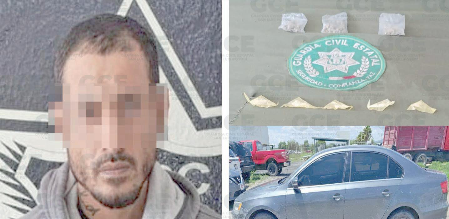lkswagen Jetta azul, sin placas de circulación. Durante la revisión, los agentes le aseguraron cinco dosis de “cristal” y tres bolsas con marihuana, por lo que fue detenido de inmediato.