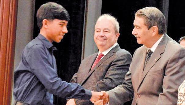 Alan Ontiveros Martínez, alumno de nuevo ingreso a la Escuela Preparatoria de Matehuala, fue reconocido por el rector de la Universidad Autónoma de San Luis Potosí (UASLP), Alejandro Javier Zermeño Guerra, por conseguir uno de los puntajes más altos en el examen de admisión general de este año.