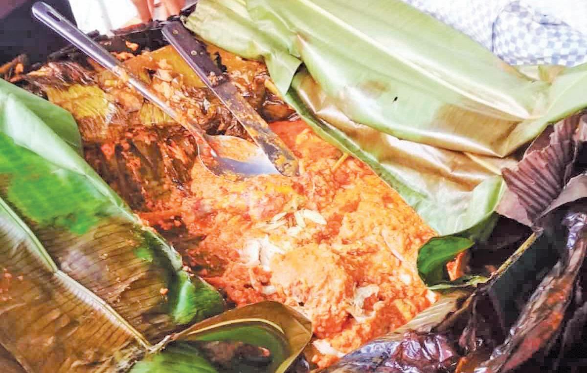 - Coloca una hoja grande de plátano en el fondo de un recipiente grande para hornear o en la olla vaporera.
