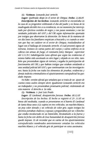 12.- Víctimas: Leonardo José Arriechi. Lugar: Quebrada Abajo en el sector de Chirgua. Fecha: 23.06.05 Descripción de los hechos: Leonardo Arriechi se encontraba en la casa de su progenitor celebrando el día del padre y en horas de la madrugada decidió irse a su residencia, en ese momento fue interceptado por efectivos vestidos de negro y con pasas montaña y con las unidades policiales del GOT y del URI según información aportada por testigos que observaron la detención. En horas de la mañana de ese día lunes los familiares empiezan a buscarlo y es cuando se enteran que hay un cadáver en el sector de Chirgua, trasladándose al lugar con el hallazgo de Leonardo Arriechi, el cual presentó signos de torturas, lesiones en varias partes del cuerpo y varios orificios en la cabeza con armas de fuego; el comisario Jotny Marques supervisor del C.I.C.P.C Subdelegación Lara afirmó que según las evidencias el mismo había sido asesinado en otro lugar y dejado en ese sitio, también que presentaban signos de tortura y negaba la participación de funcionarios del URI y que habían testigos que estaban señalando a una unidad policial del GOT y que continuarían con las investigaciones; hasta la fecha con todos los elementos de pruebas, evidencias y demás indicios criminalístico el ajusticiamiento extrajudicial ha quedado impune. No hubo versión oficial que señalara que se trata de un ajuste de cuenta como suelen siempre decir, igualmente Leonardo Arriechi era un trabajador y no presentaban prontuario policial, violentando de esta manera el derecho a la vida. 13.- Víctimas: 1- José Luís Prado Lugar: El Cardonal, desaparición forzosa. Fecha: 08.12.05 Descripción de los hechos: El hecho se registró el 29 .11.05 en horas del mediodía, cuando se presentaron en el barrio El Cardonal de Santa Rosa unos (12) sujetos en tres vehículos, un machito blanco, un jeep color dorado y un vehículo de color gris; según testigos los efectivos portaban chalecos y esposas y preguntaban por un «Chencho» que estaba involucrado en un homicidio, llevándoselo a la fuerza y hasta la fecha este delito de lesa humanidad de desaparición forzosa quedó impune. Es de recordar que en varios de los ajusticiamientos extrajudiciales nombrados anteriormente señalan los vehículos machito blanco y el vehículo gris de participar en estos asesinatos.