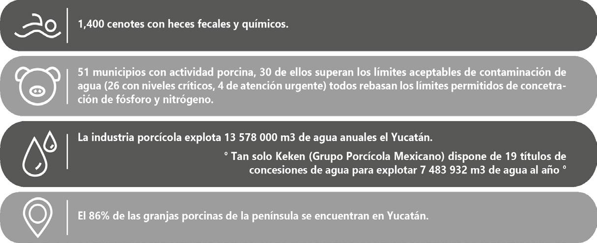 Tras un estudio realizado, se han encontrado hasta en un 83% de los cenotes yucatecos están contaminados pues se detectaron bacterias provenientes de heces animales y humanas. Esto debido principalmente a la falta de plantas de tratamiento de aguas negras y construcción excesiva de fosas sépticas cuyo contenido contaminante se traspasa a los mantos freáticos que conectan los cenotes. Tanto la negligencia de los nuevos desarrolladores inmobiliarios como del antiguo problema con la industria porcícola están culminando en un acelerado ritmo de contaminación del agua en Yucatán.