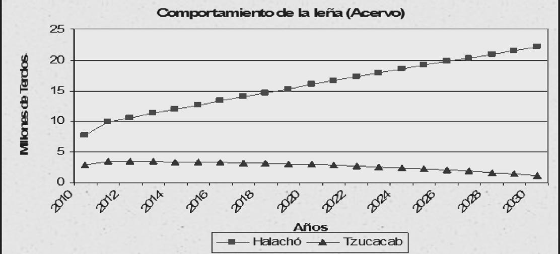El acervo se refiere a la disponibilidad del árbol y por tanto de la leña. El inventario del recurso se determina por el crecimiento natural del árbol leñable determinado por dos factores, su regeneración natural y la reforestación. Se postula inicialmente que, si los usuarios de leña aumentan, el inventario puede disminuir lo que se traduce que en un futuro existiría una presión sobre el acervo. Así, el resultado de la simulación indica diferencia entre los cuatro municipios de estudio. Con base a ello, Halachó muestra un acervo ligeramente creciente al pasar de 7.5 a 22 millones de tercios; mientras que en Tzucacab decrece al pasar de 3 a 1.1 millones de tercios.