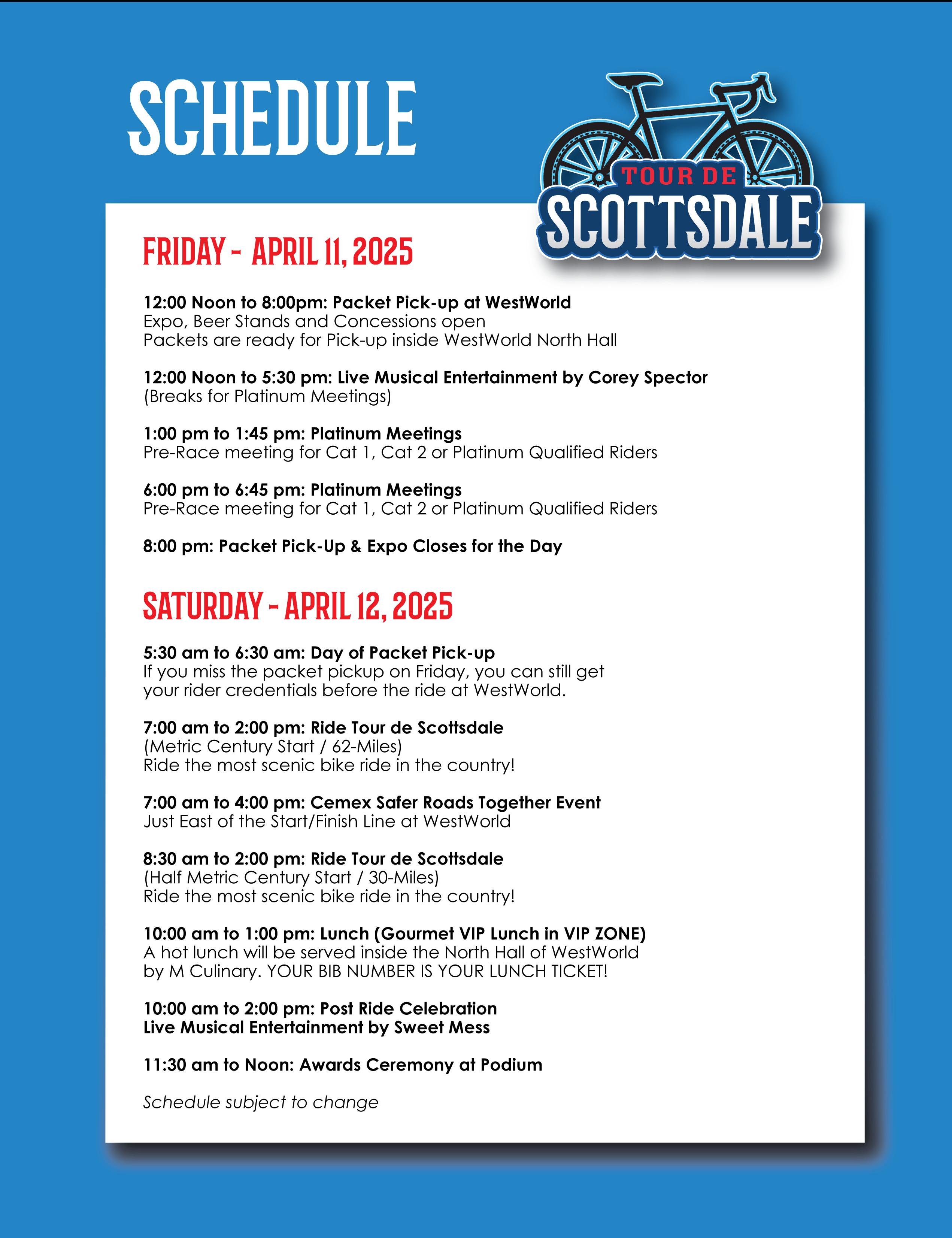 29. Tour de Scottsdale is finished at 2:00pm and all course support will be closed. Any Entrants still on the Route will be required to stop and will be transported to the Finish line by Event Officials and/or event volunteers.