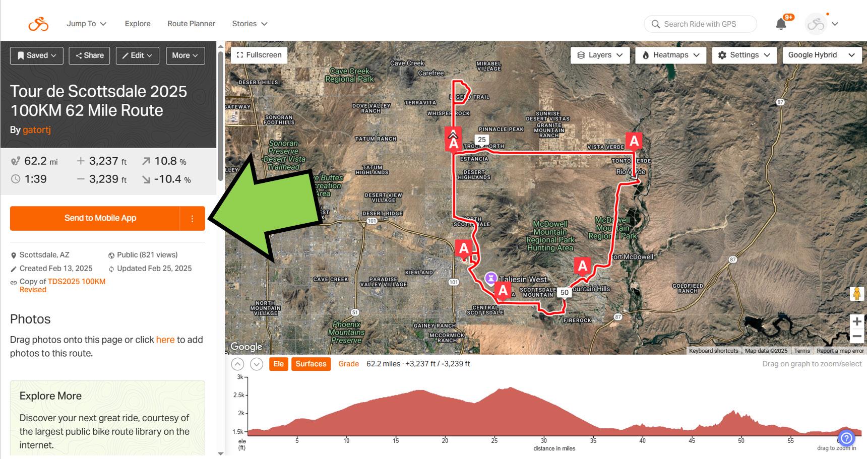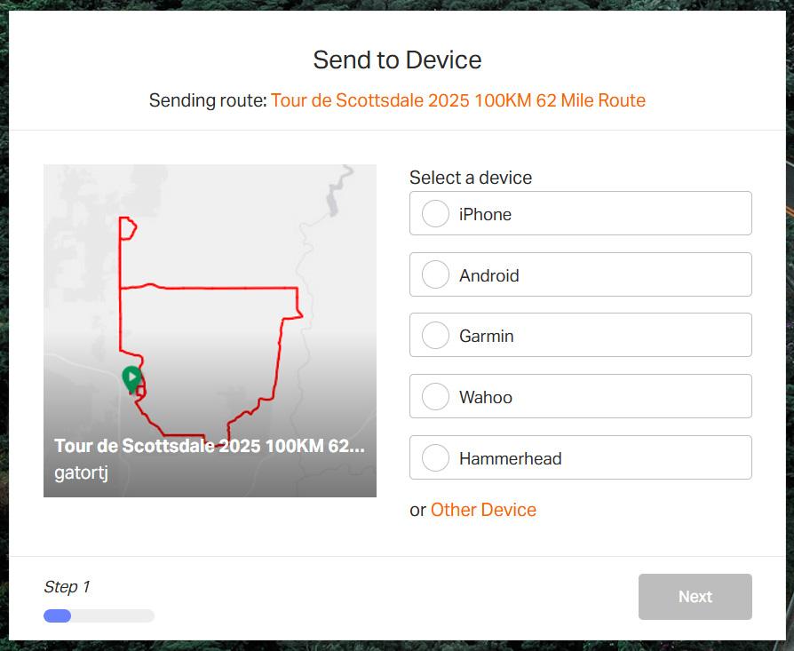 If you want to download any of the Tour de Scottsdale routes to your mobile device, visit the Tour de Scottsdale Ride with GPS website at https://ridewithgps.com/routes/49696839 or https://ridewithgps.com/routes/49804707 to see the routes on Ride with GPS. Click on Send to Mobile App or you can also Send to Device and select iPhone, Android, Garmin or Wahoo on the route you would like information about. Follow the instructions from there.