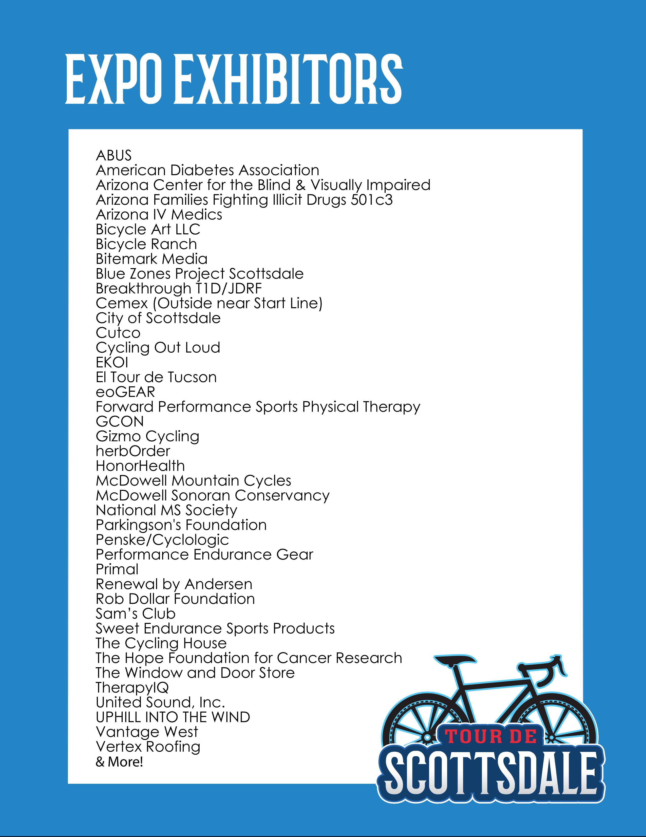 The North Hall at WestWorld is the site of Tour de Scottsdale’s two-day Expo that features our Packet Pick-Up, exhibitors, live music, platinum meetings and a beer garden. The Expo allows cyclists and attendees the opportunity to interact with exhibitors, from big bicycle brands to local shops. Merchandise sales, product demos, giveaways, celebrity athletes and contests — it’s all at the Tour de Scottsdale Expo. FREE and open to the public.