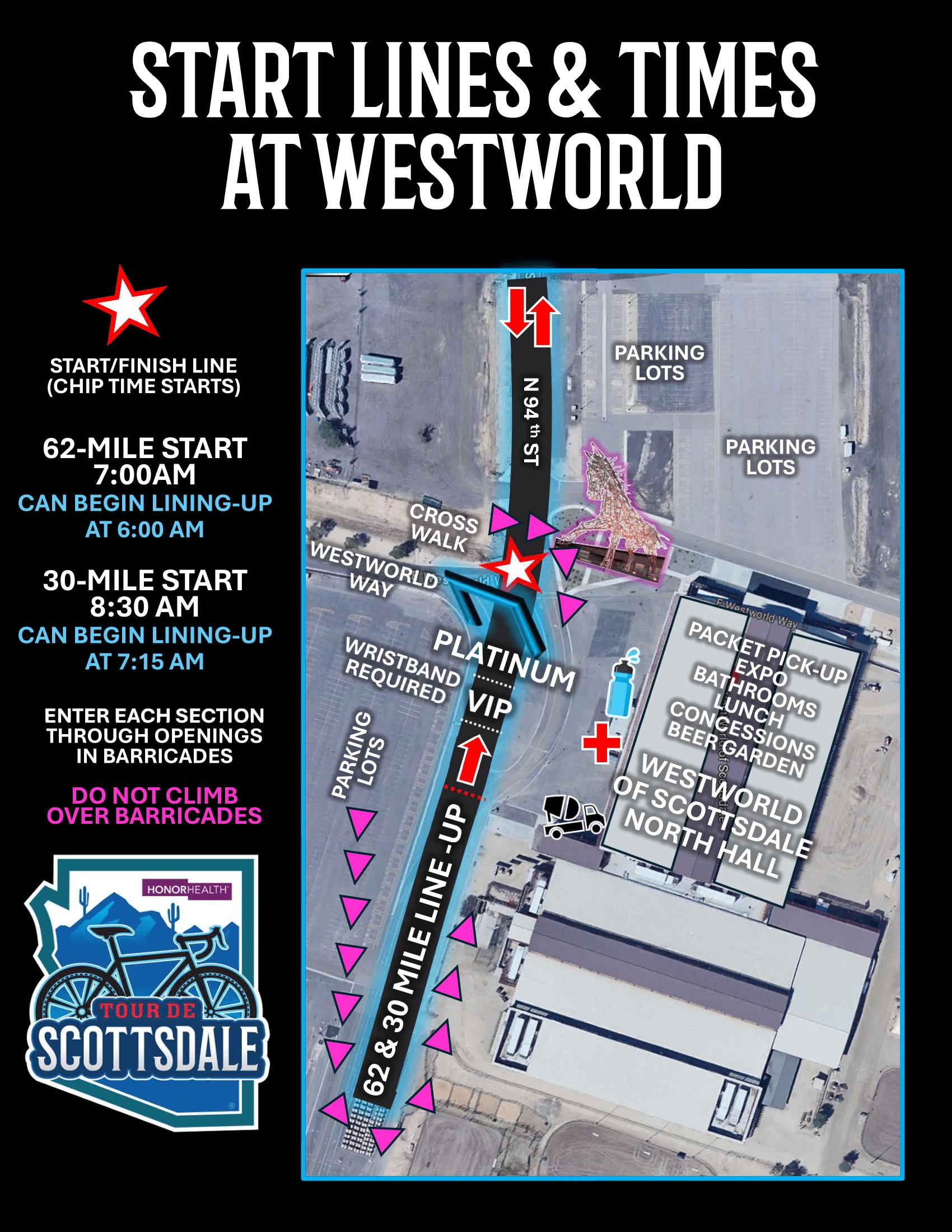 Please use these directions as there are several events that will take place at WestWorld this weekend. These directions will take you to the correct parking lots that are just north of the North Hall at West World of Scottsdale. Parking is paid by Tour de Scottsdale if you park in these correct lots.