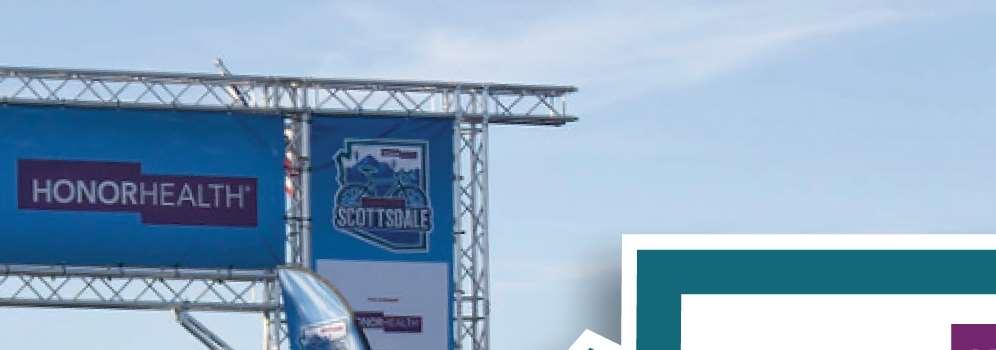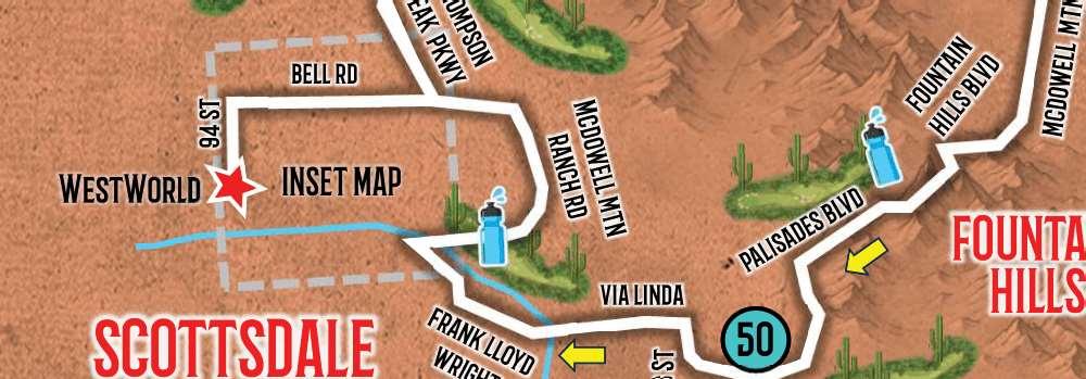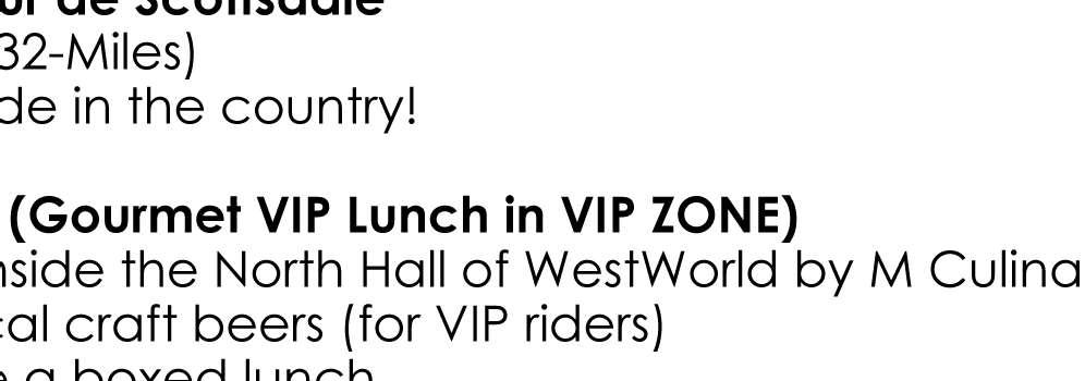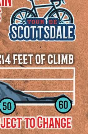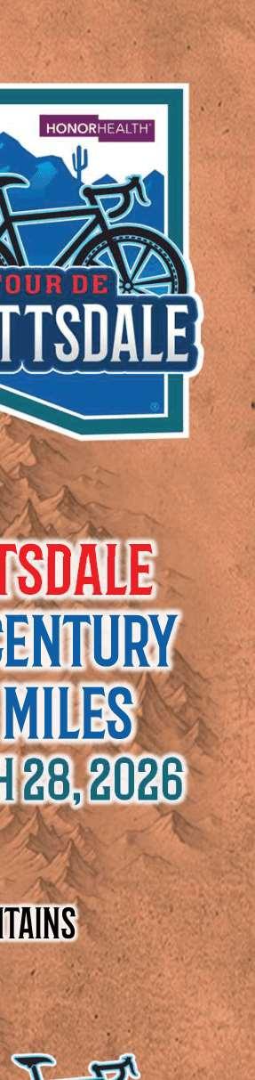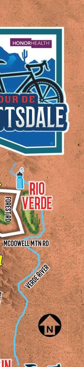 There will be 5 ofÞcial aid stations along the routes for the Tour de Scottsdale. There are 5 aid stations on the Metric Century/62-mile route and 2 stations on the Half Metric Century/32-mile route, plus a station at WestWorld that will have water provided by the City of Scottsdale. Please do not take more food than necessary; there will be other stops miles later. Please deposit all trash including peels, CO2 canisters, tubes and wrappers in trash containers. Thanks to McDowell Mountain Cycling that will assist with bike repair at Fountain Hills aid station and Bicycles of Phoenix at the Þrst aid station. When you are Þnished with your ride, there will be a hot lunch waiting for you!