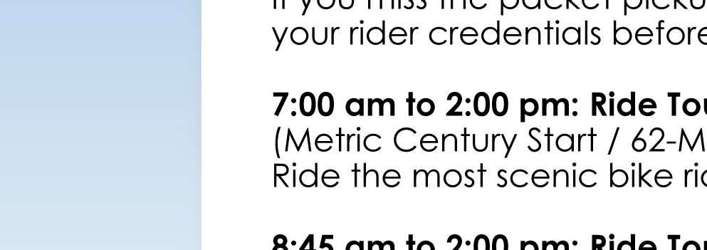 We strongly recommend that you pick up your packets on Friday. If you ordered a jersey, bibs, shorts or cycling cap with your registration, you will receive these at Packet Pick-up.