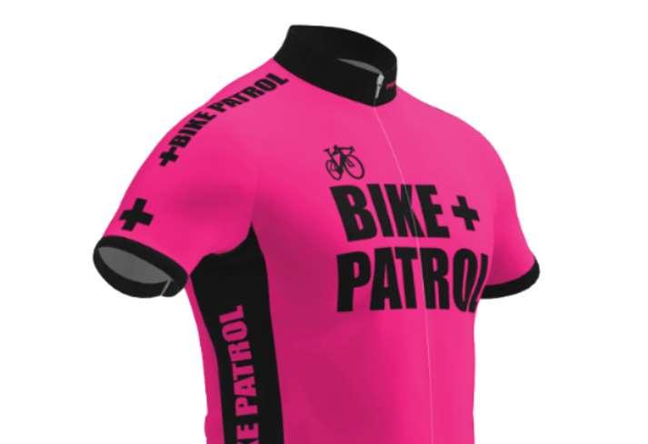 Bike Patrol will be easily recognized wearing bright yellow T-shirts or bright yellow or pink jerseys imprinted with crosses like the images above.