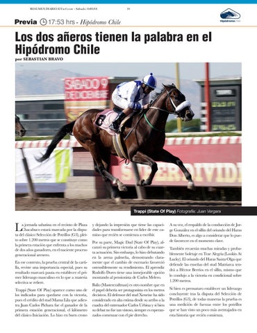 a jornada sabatina en el recinto de Plaza Chacabuco estará marcada por la disputa del clásico Selección de Potrillos (G3), pleito sobre 1.200 metros que se constituye como la primera estación que enfrenta a los machos de dos años ganadores, en el naciente proceso generacional arenero. En ese contexto, la prueba central de la cartilla, reviste una importancia especial, pues su resultado marcará pauta en establecer el primer liderazgo masculino en lo que a materia selectiva se refiere. Trappi (State Of Play) aparece como uno de los indicados para quedarse con la victoria, pues el crédito del stud Mama Lila que adiestra Juan Carlos Pichara fue el ganador de la primera estación generacional, el kilómetro del clásico Iniciación. Lo hizo en buen crono