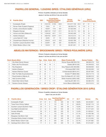 PADRILLOS GENERACIÓN / SIRES CROP / ÉTALONS GÉNÉRATION 2015 (URU) Primeros 10 padrillos ordenados por Sumas Ganadas Hasta 13 de Junio de 2018