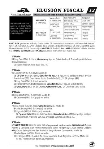 1ª Madre 04 Easy Cash (BRA) (h. Ibero), Ganadora y figs., en Cidade Jardim, 4º Prueba Especial Garbosa Bruleur. Madre de: 09 Elusión Fiscal (m. Hard Buck) (Oct. 15) 2ª Madre 98 Cashmere (ARG) (h. Cipayo), Madre de: 03 Di Gian (BRA) (m. Ibero), Ganador de 4cs., y 6 figs., en 13 salidas en Brasil. 3º Gran Premio Natal (G3), Gran Premio do Rio Grande Do Sul (L), 5º GP Ipirangá (G1). 04 Easy Cash (BRA) (h. Ibero), ver arriba. 05 Flander (BRA) (h. Blade Prospector), Ganador de 2cs. y figs., en Cidade Jardim. 06 Gallardo (BRA) (m. Ski Champ), Ganador de 2cs. GP Cidade de Santa María. 3ª Madre 84 Atlas Beauty (ARG) (h. Farnesio), Madre de: 98 Cashmere (ARG) (h. Cipayo), ver arriba. 4ª Madre 72 Atlas Figure (ARG) (h. Atlas), Ganadora de 2cs., Madre de: 84 Atlas Beauty (ARG) (h. Farnesio), ver arriba. 86 Figurelle (ARG) (h. El Virtuoso), Madre de: 02 Figuron Halo (ARG) (m. Halo Sunshine), Ganador de 2cs. (1800m) y 4 figs. en 8 presentaciones en Argentina, $54.350. 2º Clasico Malvinas Argentinas (L). 5ª Madre 67 SNOW FIGURE (ARG) (h. Snow Cat), Campeona de su Generación. Ganadora de 5cs. en Palermo y San Isidro. Gran Premio Internacional Carlos Pellegrini (G1), Gran Premio Criadores (G1), Círculo de Propietarios de Caballerizas Sangre Pura de Carrera (G3)., Madre de: 72 Atlas Figure (ARG) (h. Atlas), ver arriba. 73 First Figure (ARG) (h. Atlas), No corrió. Importada desde Argentina en 1976., Madre de: 77 Best Figure (CHI) (h. Balconaje), Madre de: vea fotografías en www.cuatropiedras.com