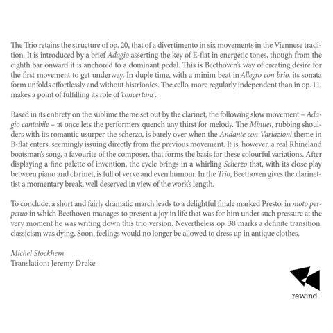 The Trio retains the structure of op. 20, that of a divertimento in six movements in the Viennese tradition. It is introduced by a brief Adagio asserting the key of E-flat in energetic tones, though from the eighth bar onward it is anchored to a dominant pedal. This is Beethoven’s way of creating desire for the first movement to get underway. In duple time, with a minim beat in Allegro con brio, its sonata form unfolds effortlessly and without histrionics. The cello, more regularly independent than in op. 11, makes a point of fulfilling its role of ‘concertans’. Based in its entirety on the sublime theme set out by the clarinet, the following slow movement – Adagio cantabile – at once lets the performers quench any thirst for melody. The Minuet, rubbing shoulders with its romantic usurper the scherzo, is barely over when the Andante con Variazioni theme in B-flat enters, seemingly issuing directly from the previous movement. It is, however, a real Rhineland boatsman’s song, a favourite of the composer, that forms the basis for these colourful variations. After displaying a fine palette of invention, the cycle brings in a whirling Scherzo that, with its close play between piano and clarinet, is full of verve and even humour. In the Trio, Beethoven gives the clarinettist a momentary break, well deserved in view of the work’s length. To conclude, a short and fairly dramatic march leads to a delightful finale marked Presto, in moto perpetuo in which Beethoven manages to present a joy in life that was for him under such pressure at the very moment he was writing down this trio version. Nevertheless op. 38 marks a definite transition: classicism was dying. Soon, feelings would no longer be allowed to dress up in antique clothes. Michel Stockhem Translation: Jeremy Drake