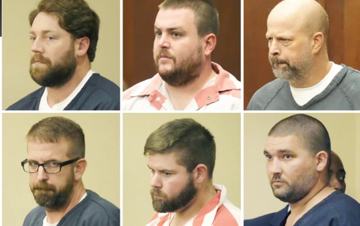 Los acusados de torturar a dos hombres negros en Mississippi. Desde la izquierda superior: los expolicías del condado Rankin (Mississippi) Hunter Elward, Christian Dedmon, Brett McAlpin, Jeffrey Middleton, Daniel Opdyke y el expolicía de Richland, Joshua Hartfield en el tribunal del condado Rankin en Brandon, Mississippi, el 14 de agosto de 2023. (Foto AP /Rogelio V. Solis)