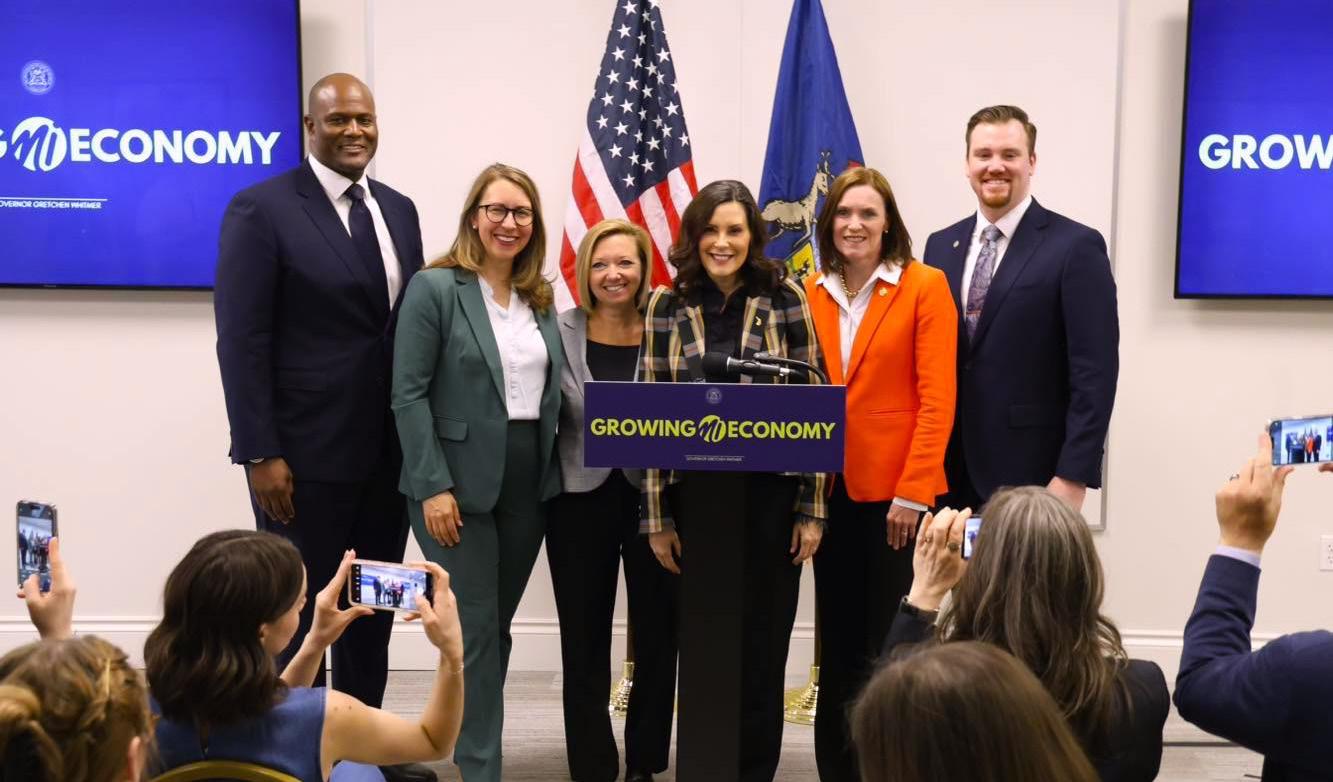 La gobernadora Gretchen Whitmer visitó Grand Rapids el lunes 15 de abril después de haber firmado el proyecto de ley que otorgó a las localidades de Michigan la facultad de establecer impuestos hoteleros. (Foto cortesía de la oficina del representante estatal John Fitzgerald)