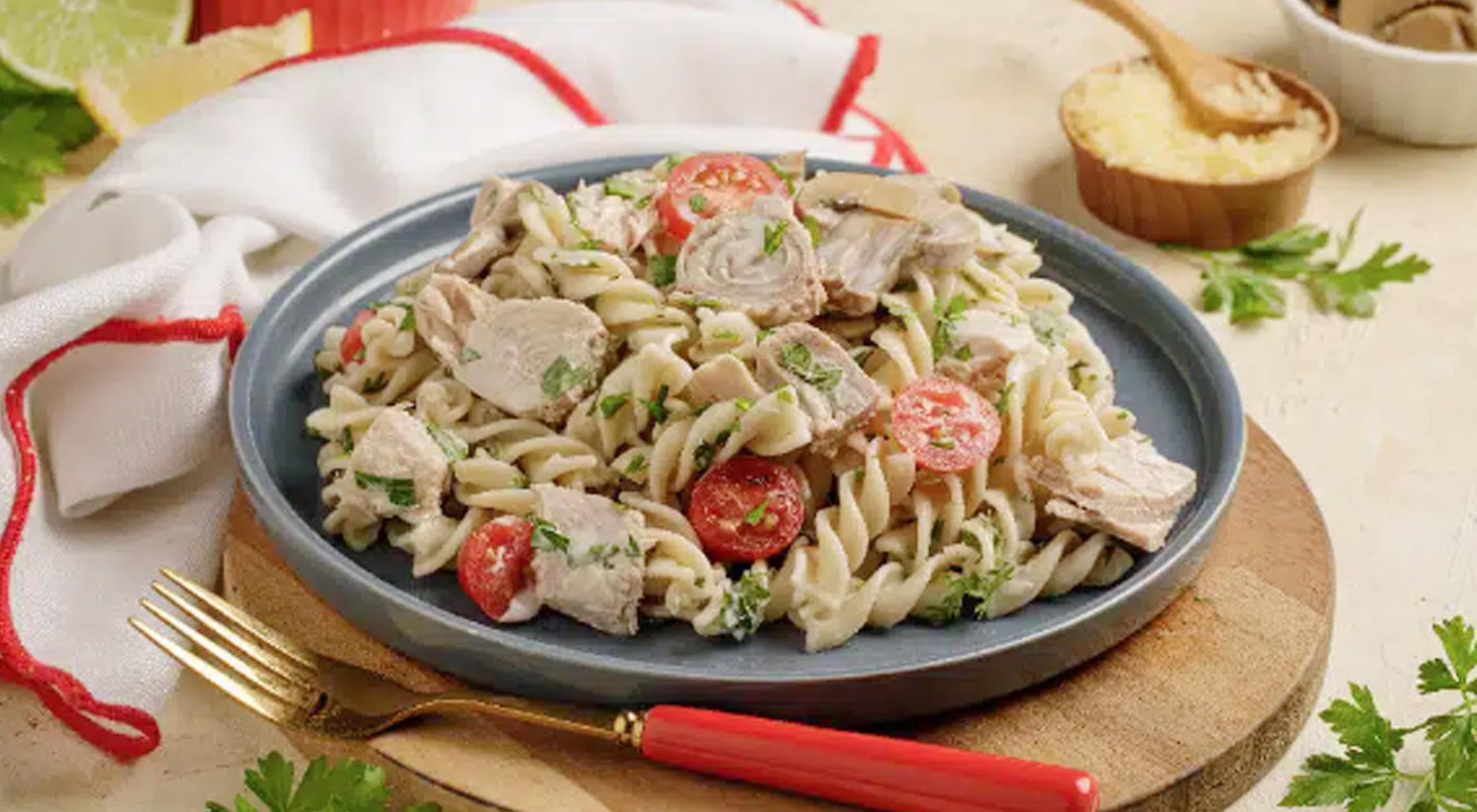 TORNILLOS DE PASTA Y ATÚN EN AGUA ZENÚ CON CHAMPIÑONES Y SALSA BLANCA