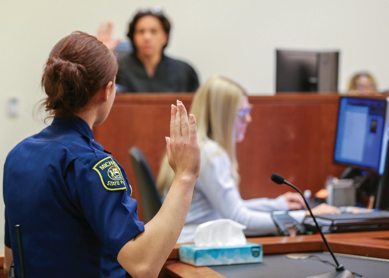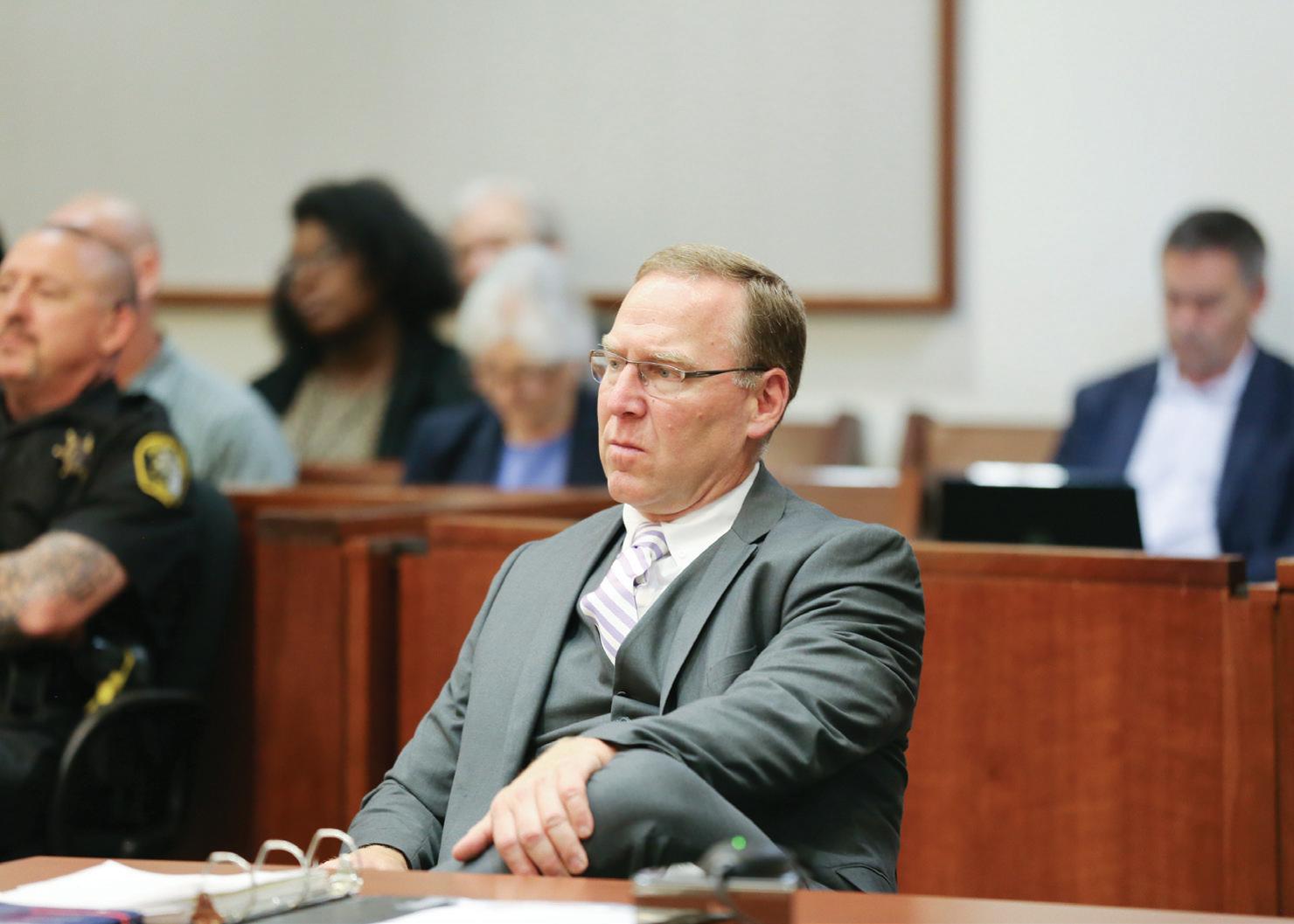 El fiscal del Condado de Kent, Chris Becker, y el detective/sargento de la Policía Estatal de Michigan, Aaron Tubergen, hablan durante el examen preliminar de Brandon Ortiz-Vite en el juzgado del condado de Kent el miércoles 29 de mayo de 2024. (Foto: KARLA BAHM / EVH)