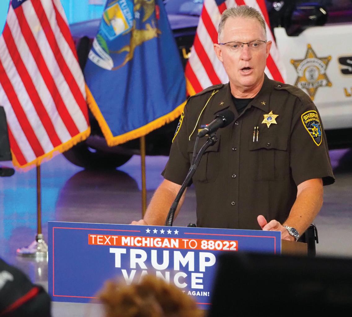 El alguacil del condado de Livingston, Mike Murphy, habla en la conferencia de prensa sobre “Crimen y seguridad” celebrada por la campaña de Trump en Howellel el 20 de agosto de 2024. Según una resolución aprobada el lunes 23 de septiembre por la Junta de Comisionados del condado de Livingston, la oficina del alguacil del condado comenzará a documentar sus interacciones con inmigrantes indocumentados. (Foto de Jon King/ AP)