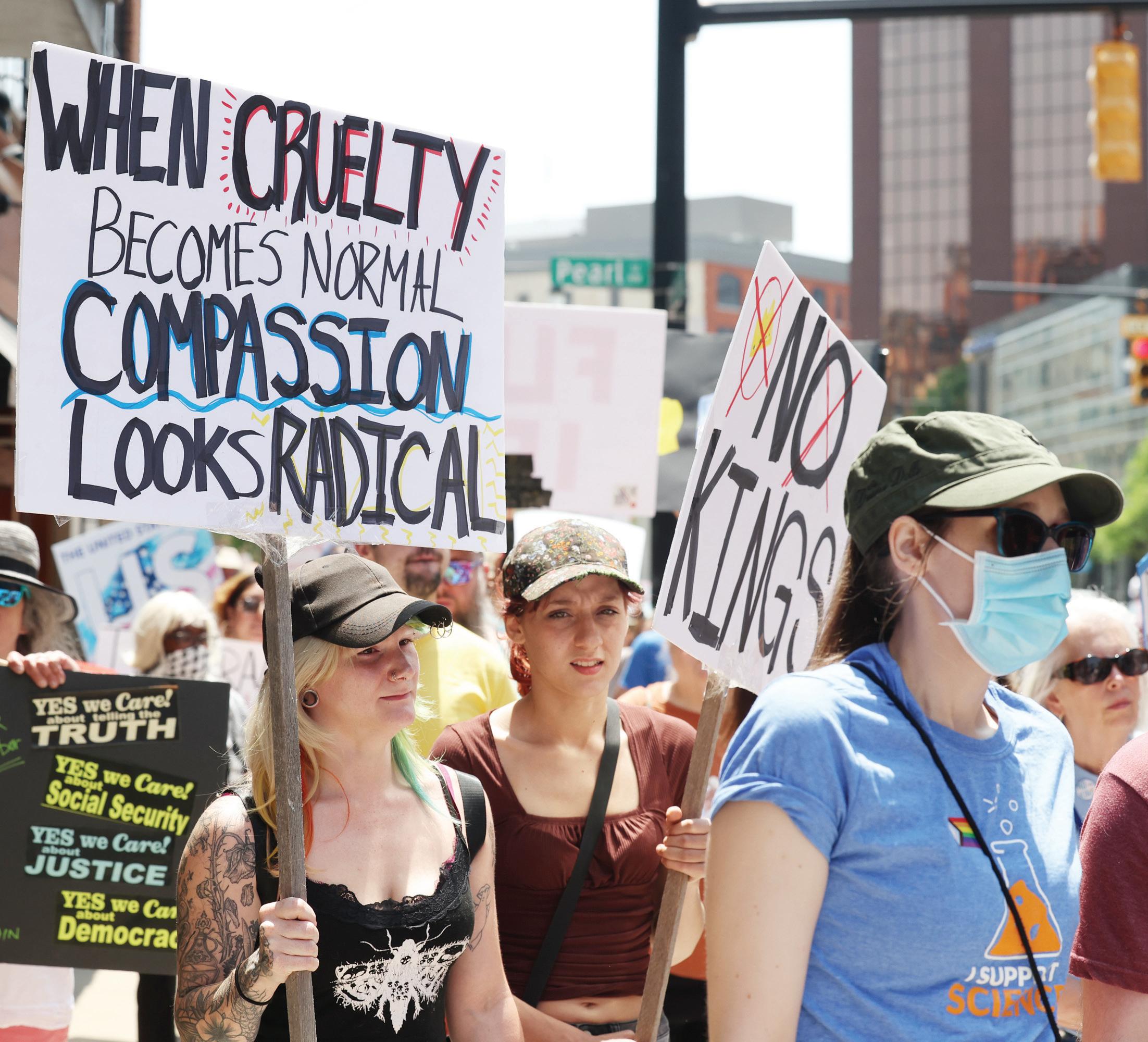 Manifestantes de todas las edades se congregaron el 14 de junio en Rosa Parks Circle en Grand Rapids, como parte de una jornada de más de 2.000 protestas simultáneas en todo Estados Unidos. Las movilizaciones, convocadas bajo el lema “No Kings”, denunciaron la persecución a inmigrantes y el poder desmedido del ejecutivo federal. En Grand Rapids, la marcha se desarrolló de forma pacífica y sin arrestos. Foto: Andrés Abreu/ EVH