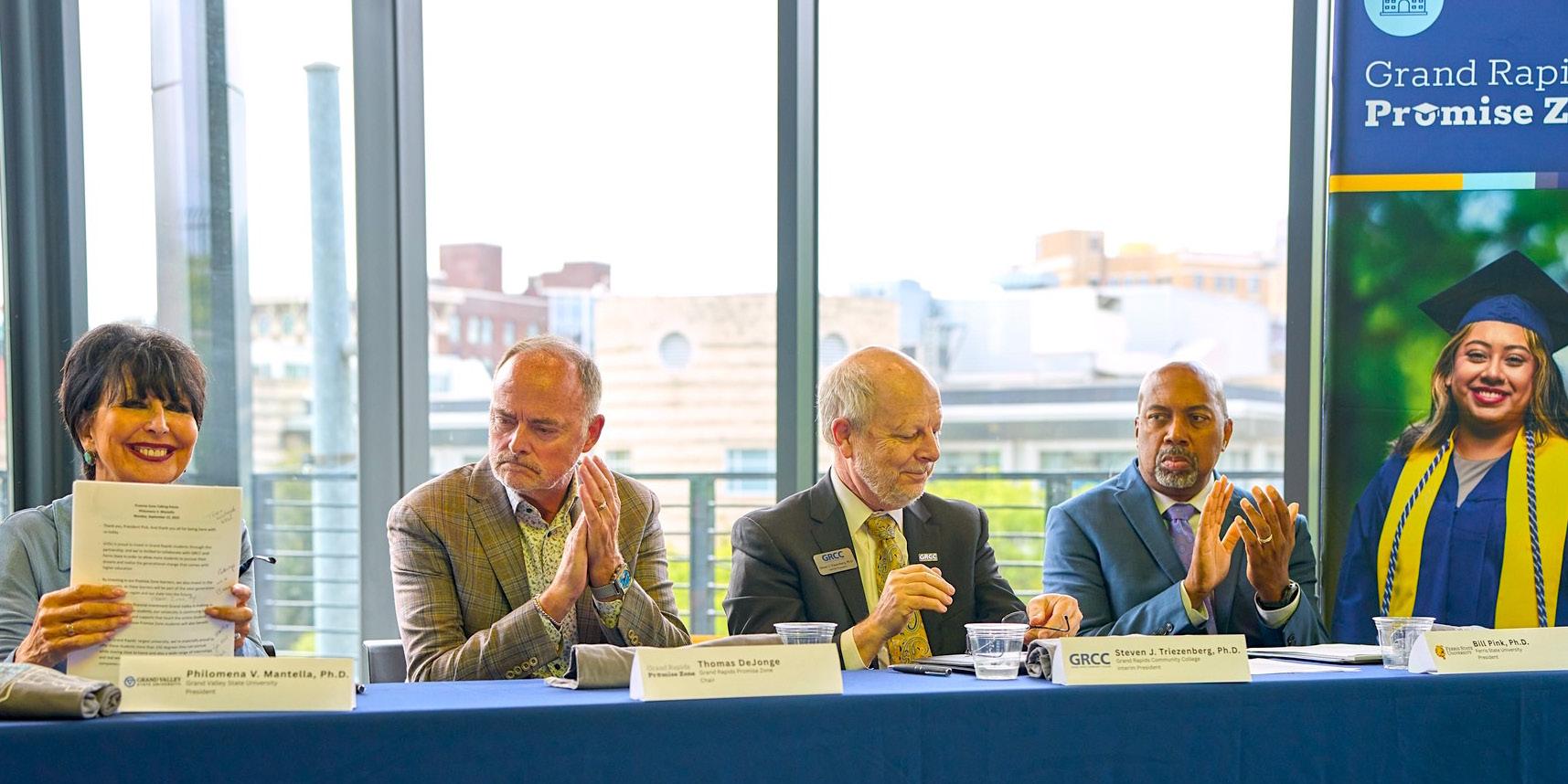 De izquierda a derecha: la presidenta de la Grand Valley State University, Philomena Mantella, Ph.D.; el presidente de la Grand Rapids Promise Zone, Tom DeJonge; el presidente interino de Grand Rapids Community College, Steven Triezenberg, Ph.D.; el presidente de la Ferris State University, Bill Pink, Ph.D. (Foto cortesía de Grand Rapids Promise Zone Authority)