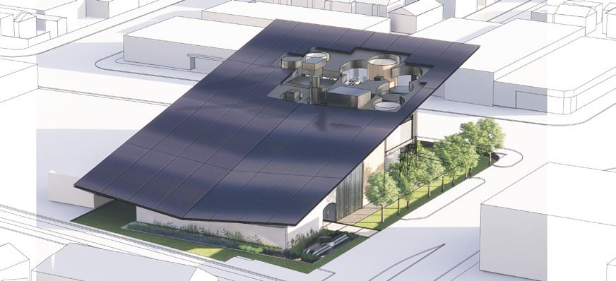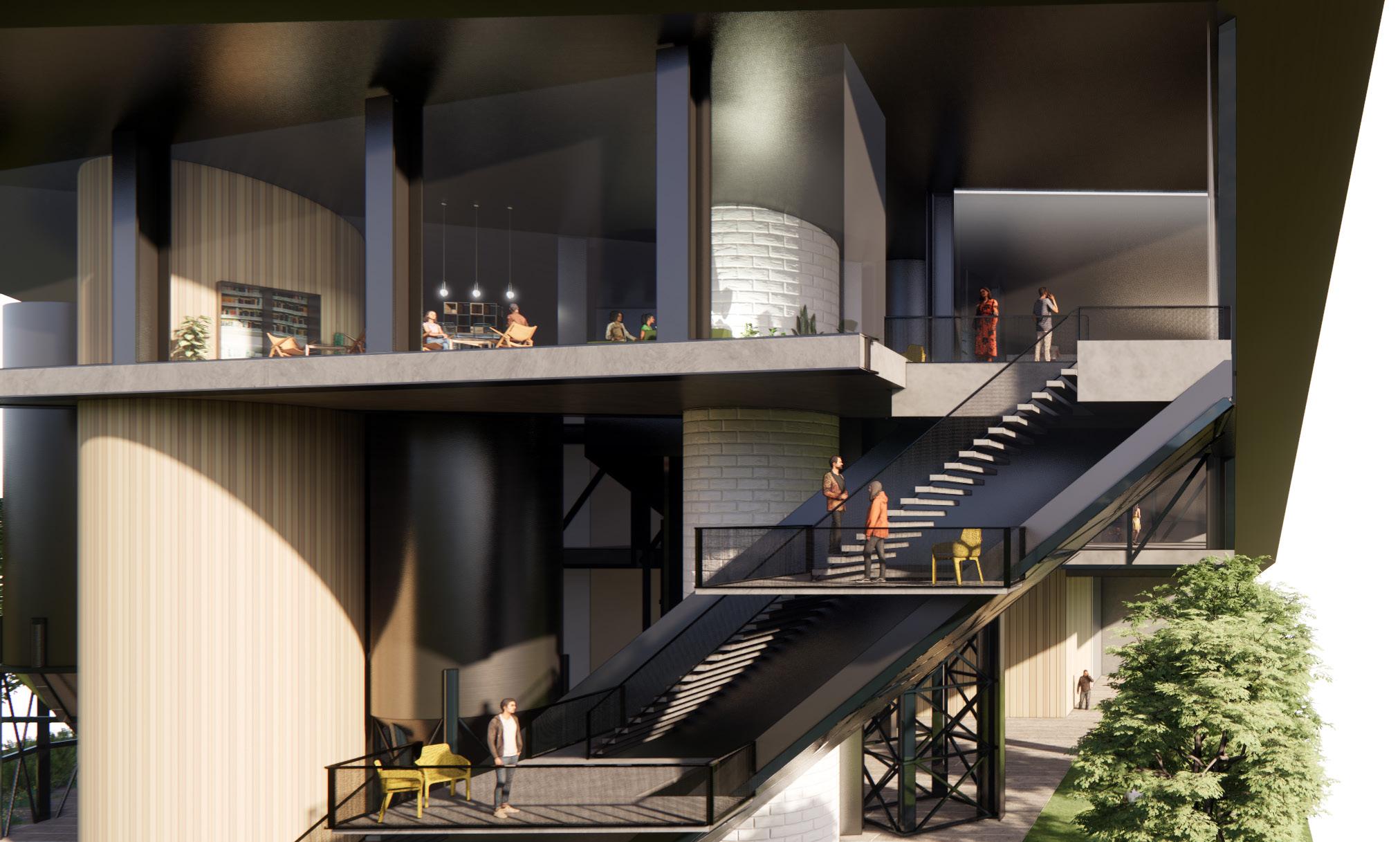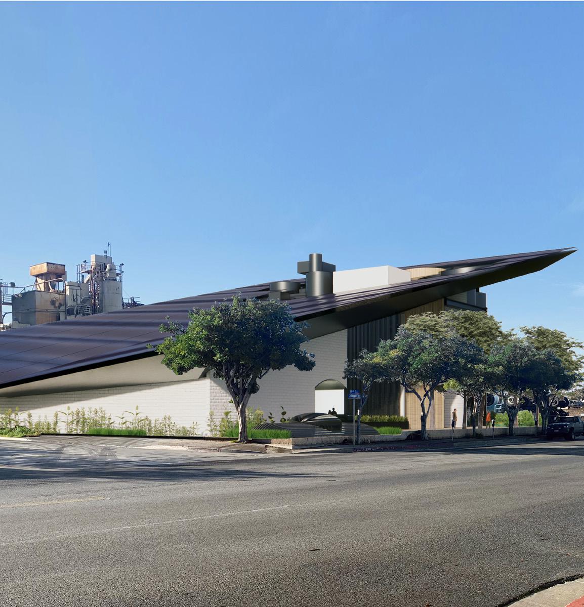OVERVIEW The overall geometries introduce an optical compositional device of a monumentally scaled roof which collages several polymetric shapes. Much like those portrayed in Ellsworth Kelly’s paintings, the elements of the research center are all collected under a single sloping surface. The simplicity of the structure interacts with the complexity of the silo geometries to create a banding organizational strategy. The massive roof structure serves not only as a unifying technique but also an important source of energy, with its vast surface area providing 3,600 kilowatt hours of energy per day. The various building components serve as areas to research, cultivate, and exhibit the use of kelp, mycelium and teak as building techniques. This is a cultural exhibition as well as an industrial production space. The project is both a work of abstraction and infrastructure.