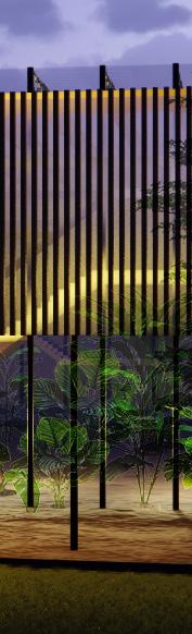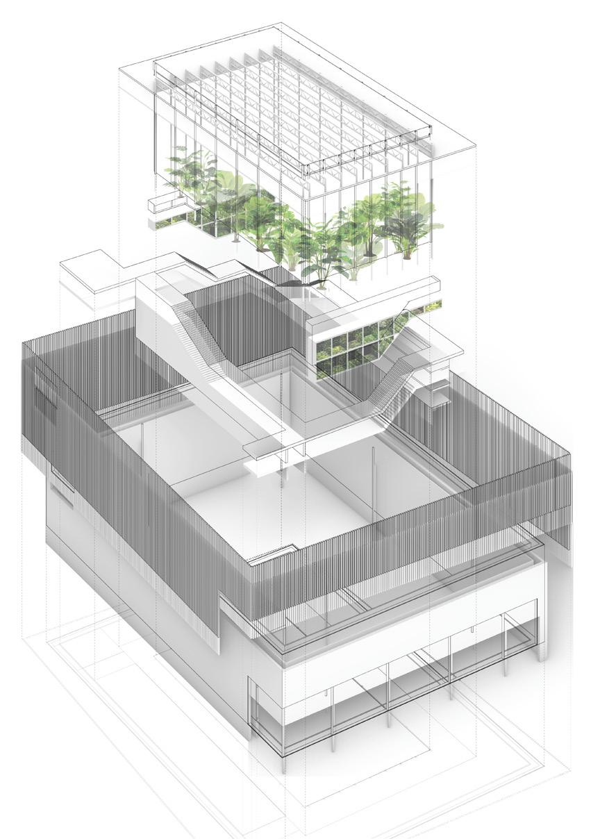 By keeping the space open, the highly porous elements are visible to all users. Although the overall structure seems insensitive to the landscape, the idea is to slip under the facade and become immersed in an extension of the plant life.