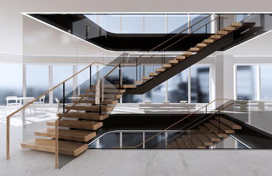The digital design elements of this project promoted its uniqueness and contradiction to traditional workplace interiors. The digital features include interactive walls with the integration of light and human activity. Visitors would be greeted with a digital skyline, which signifies their current New York location and other global locations of the consulting firm. The internal circular stairs promote the visibility of movement and energy within the space and full connection to the user experience.