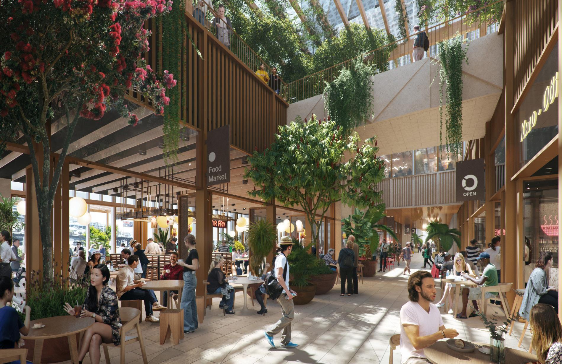 Cockle Bay Park focuses on the eye-level experience of the development’s two scales: the city scale, where the tower joins the skyline, and the village scale, where people move between the city center and the waterfront.