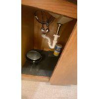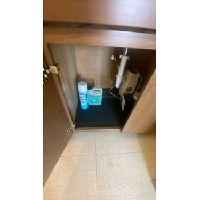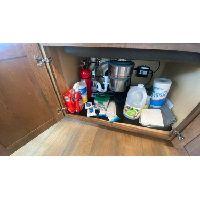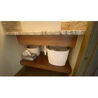 Photo of under the sink and in drawers showing towels, soaps, toilet paper, and organization