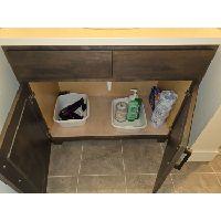 Photo of under the sink and in drawers showing towels, soaps, toilet paper, and organization