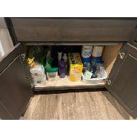 Photo of under the sink and in drawers showing towels, soaps, toilet paper, and organization