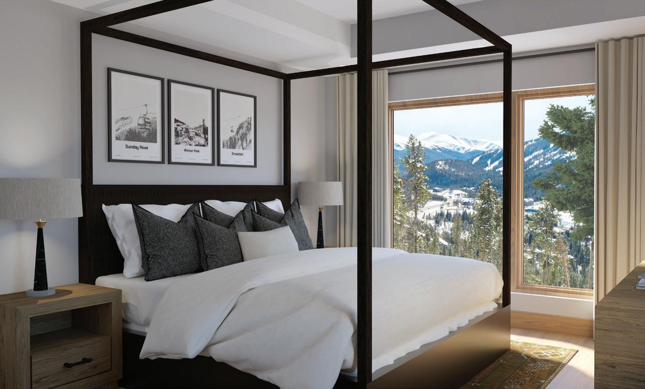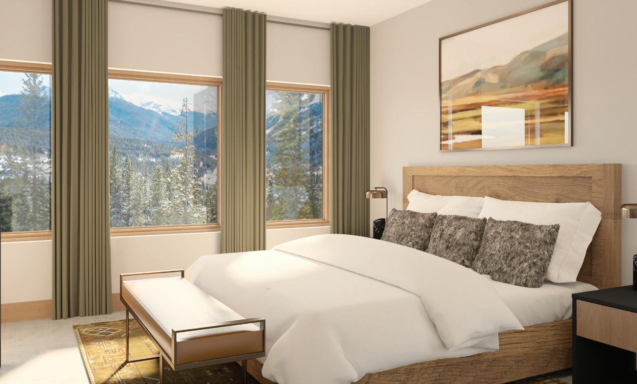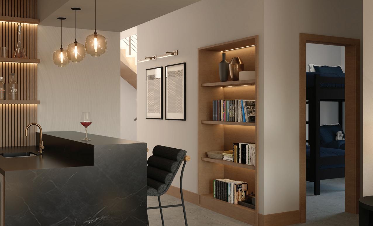 The main floor features cutting edge design and magnificent mountain views. You’ll enjoy a bespoke chef’s kitchen, dining area to accommodate 12 or more, large deck, living room with fireplace, one primary suite, and a powder room.