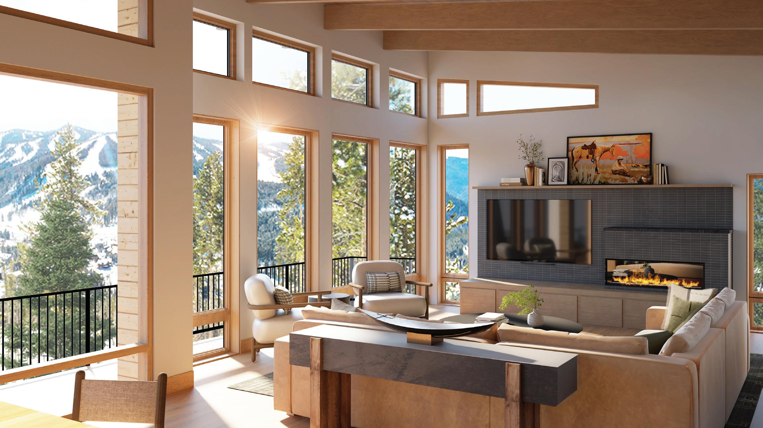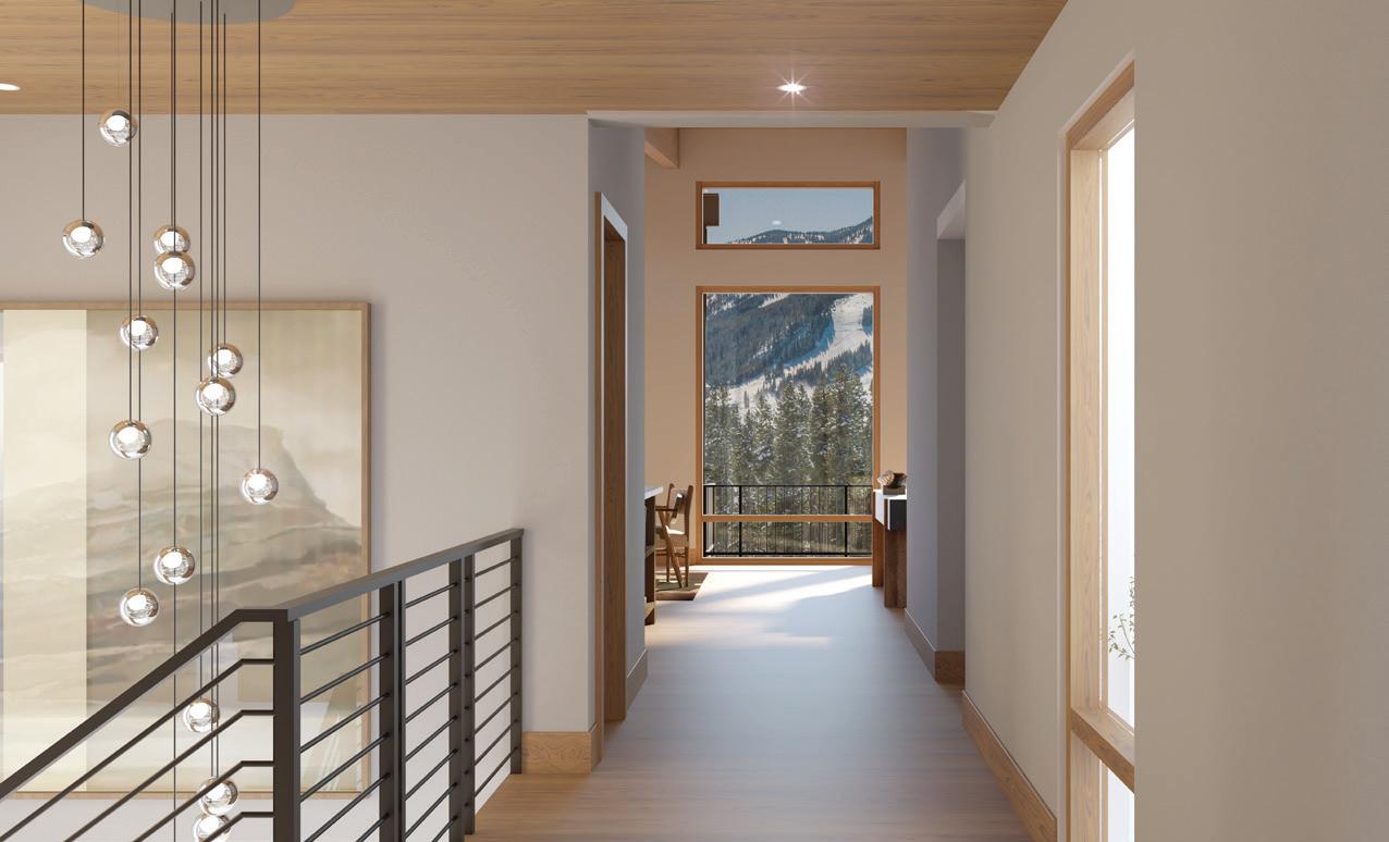 The main floor features cutting edge design and magnificent mountain views. You’ll enjoy a bespoke chef’s kitchen, dining area to accommodate 12 or more, large deck, living room with fireplace, one primary suite, and a powder room.