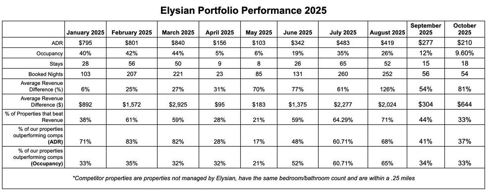 As is traditional, October was a softer month for the mountain market — but Elysian once again outperformed. We achieved 5.6% Adjusted Paid Occupancy, compared to 1.4% for the broader market. Looking ahead, November is pacing at 15% occupancy, while the market sits at 10.7%, underscoring our sustained pricing power and market capture even during shoulder periods.