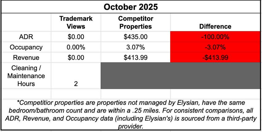 As is traditional, October was a softer month for the mountain market — but Elysian once again outperformed. We achieved 5.6% Adjusted Paid Occupancy, compared to 1.4% for the broader market. Looking ahead, November is pacing at 15% occupancy, while the market sits at 10.7%, underscoring our sustained pricing power and market capture even during shoulder periods.