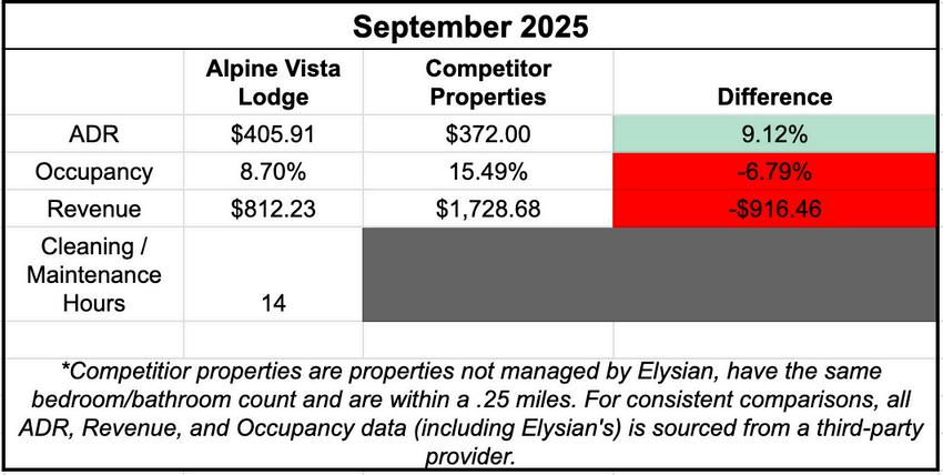 We’ve completed our first quarterly deep dive into market performance, blending insights from four premium data sources into our proprietary pricing model. The results are clear: our homes continue to command standout performance. Across our portfolio, the average Target ADR (Average Daily Rate) is tracking at $810, with blended market comparisons closer to $648. Neighborhood analysis shows Lakota leading the market with the highest ADR per bedroom ($214) and strong occupancy (44%), while even the softer markets like Fraser West maintain healthy occupancy near 36%. This disciplined, data-backed approach ensures we are maximizing both rate and occupancy for every property.