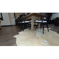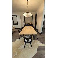 Photo of clean dining room with all lights on -Clean chandelier -Clean chairs -Clean Table -Floor Level under furniture