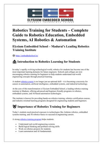 Elysium Embedded School (EES) was established by Elysium Groups in 2015 to offer Embedded Systems and Robotics certification training courses. Embedded Systems are becoming prevalent in every aspect of daily life. The growth of sectors like automotive, telecommunications, aerospace, energy, industrial units, biomedical equipment, consumer goods is highly contributed by the development in the field of Embedded Systems and Robotics. We at EES can guide you through all the complexity of the discipline to become an expert. We welcome students from all over the country to join us to boost their career and to be the part of the Embedded Revolution. Phone: 96777 24437
