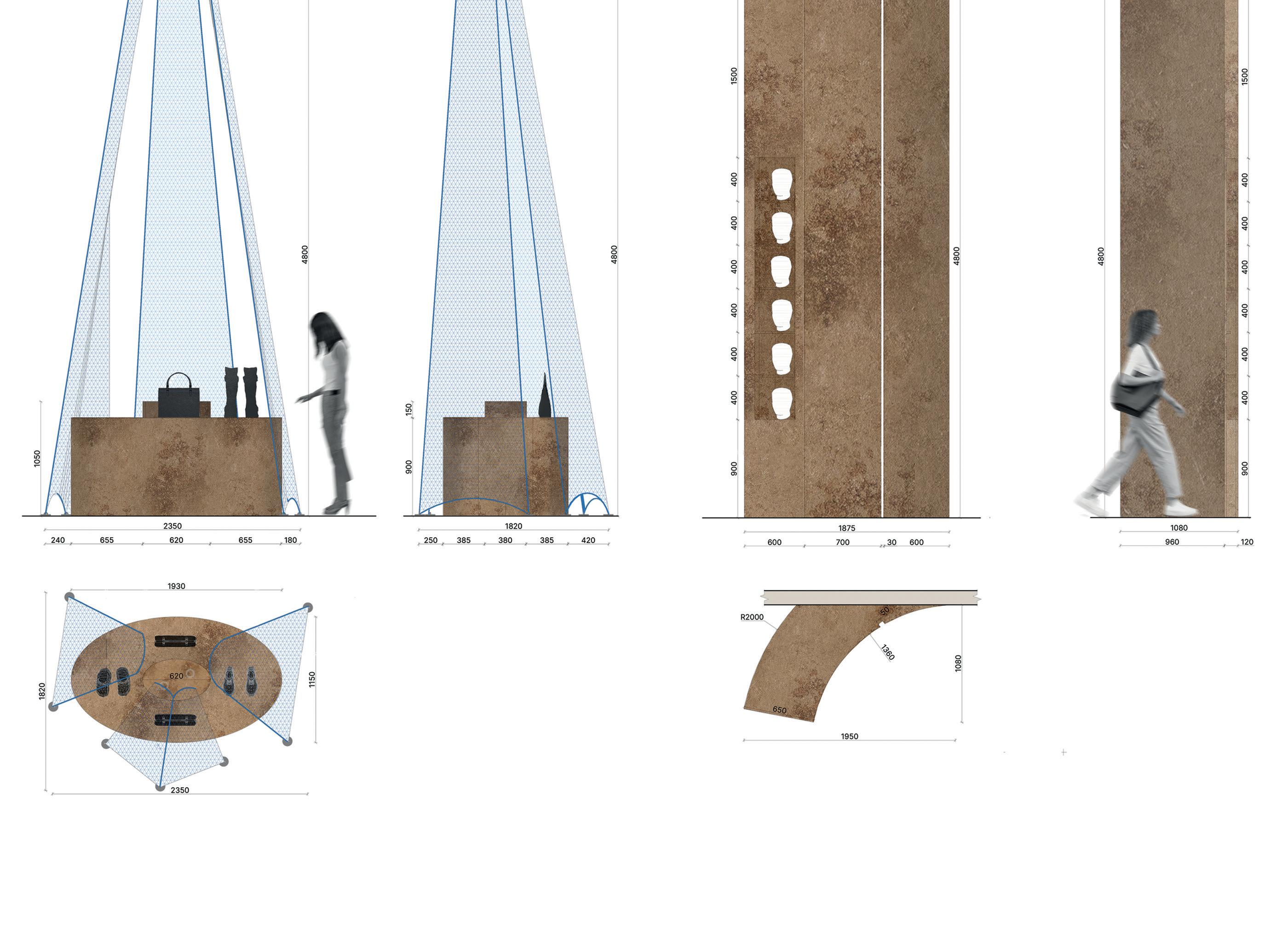 Sienių kabyklų sprendiniai nišoje: eksponuojami „sunkesni“ drabužiai. Ekspozicinis sprendinys- nišos erdvės lenktose sienose. Lubinės ir sieninės kabyklos atkartojančios lenktas sienas.