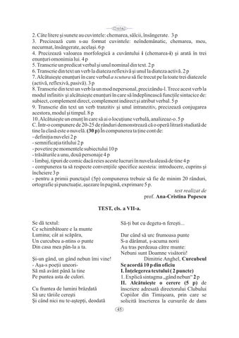 2. Câte litere şi sunete au cuvintele: chemarea, sălcii, însângerate. 3 p 3. Precizează cum s-au format cuvintele: neîndemânatic, chemarea, meu, necurmat, însângerate, acelaşi. 6 p 4. Precizează valoarea morfologică a cuvântului i (chemarea-i) şi arată în trei enunţuri omonimia lui. 4 p 5. Transcrie un predicat verbal şi unul nominal din text. 2 p 6. Transcrie din text un verb la diateza reflexivă şi unul la diateza activă. 2 p 7. Alcătuieşte enunţuri în care verbul a scutura să fie trecut pe la toate trei diatezele (activă, reflexivă, pasivă). 3 p 8. Transcrie din text un verb la un mod nepersonal, precizându-l. Trece acest verb la modul infinitiv şi alcătuieşte enunţuri în care să îndeplinească funcţile sintacice de: subiect, complement direct, complement indirect şi atribut verbal. 5 p 9. Transcrie din text un verb tranzitiv şi unul intranzitiv, precizează conjugarea acestora, modul şi timpul. 8 p 10. Alcătuieşte un enunţ în care să ai o locuţiune verbală, analizeaz-o. 5 p C. Într-o compunere de 20-25 de rânduri demonstrează că o operă litrară studiată de tine la clasă este o nuvelă. (30 p) În compunerea ta ţine cont de: - definiţia nuvelei 2 p - semnificaţia titlului 2 p - povetire pe momentele subiectului 10 p - trăsăturile a unu, două personaje 4 p - limbaj, tipuri de comic dacă reies aceste lucruri în nuvela aleasă de tine 4 p - compunerea ta să respecte convenţiile specifice acesteia: introducere, cuprins şi încheiere 3 p - pentru a primii punctajul (5p) compunerea trebuie să fie de minim 20 rânduri, ortografie şi punctuaţie, aşezare în pagină, exprimare 5 p. test realizat de prof. Ana-Cristina Popescu TEST, cls. a VII-a. Se dă textul: Ce schimbătoare e la munte Lumina; cât ai scăpăra, Un curcubeu a-ntins o punte Din casa mea pân-la a ta. Şi-un gând, un gând nebun îmi vine! - Aşa-s poeţii uneoriSă mă avânt până la tine Pe puntea asta de culori. Cu fruntea de lumini brăzdată Să urc tăriile cereşti Şi când nici nu te-aştepţi, deodată
