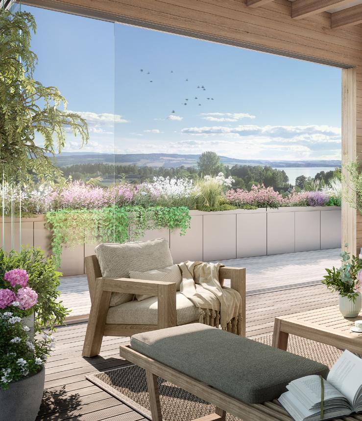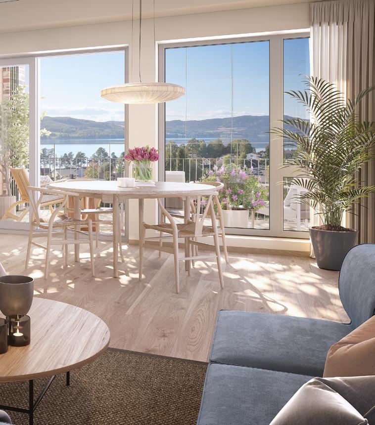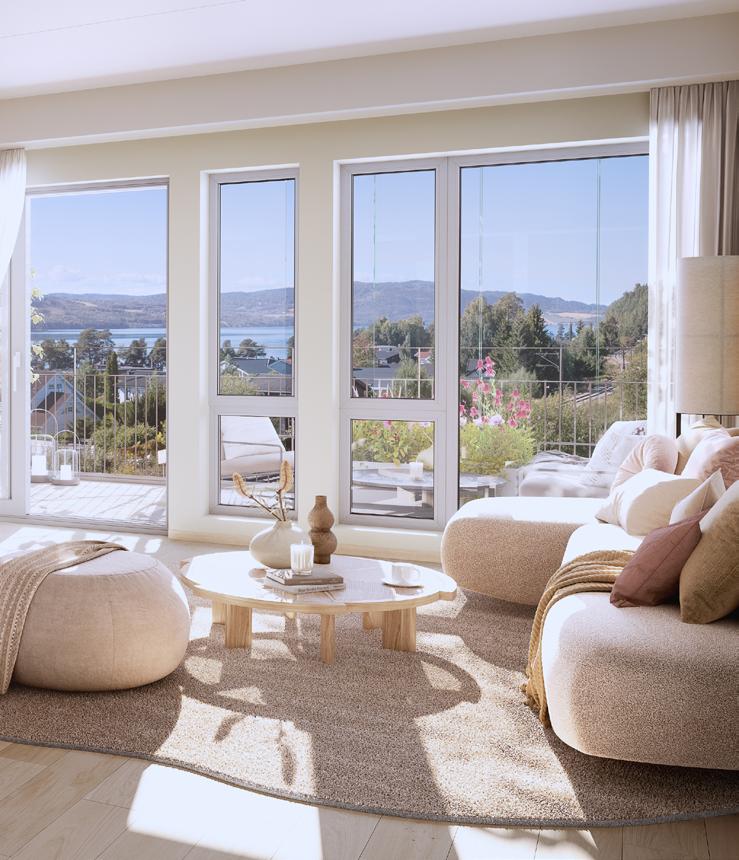 Kornhavens arkitekter og utbygger har lagt mye arbeid i byggenes plassering på tomta. Dette for å sikre at flest mulig får best mulig utsikt. Det er tross alt Mjøsa det er snakk om! Arkitektenes valg av store vinduer er ikke tilfeldig, og sikrer deg godt med dagslys i boligen.